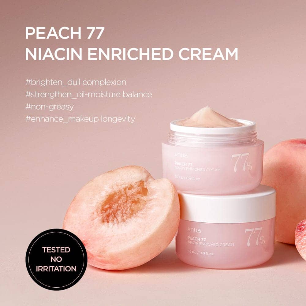 کرم ANUA Peach 77 Niacin Enriched Cream ترکیبی سبک، آبرسان و بدون چسبندگی است که با ۷۷٪ آب میوه هلو تخمیری و نیاسینامید، پوست را نرم، مرطوب و درخشان میکند.این کرم از ترکیب فرمنت سهگانه (Peach + Galactomyces + Bifida) برای تأمین رطوبت و بازسازی پوست بهره میبرد و با داشتن پانتنول، سرامید و کلاژن محلول، به تقویت سد دفاعی پوست کمک میکند.فرمول صورتی طبیعی این کرم از ویتامین B12 گرفته شده و هیچ رنگ مصنوعی در آن بهکار نرفته است 💗نتیجه؟ پوستی شاداب، لطیف و درخشان با حس سبکی بینظیر!