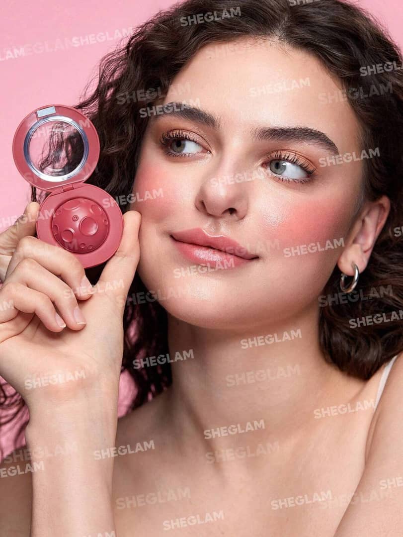 ۱. با پف نیمکرهای رژگونه را به آرامی روی گونهها بزنید.