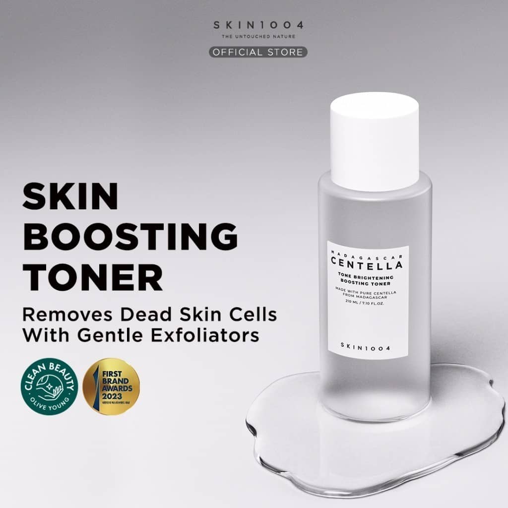 تونر روشنکننده و تقویتکننده Centella Tone Brightening Boosting Toner از برند مطرح Skin1004 کره، محصولی قدرتمند با فرمول غنیشده از عصارهی خالص Centella Asiatica ماداگاسکاری و ترکیبات شفافکننده نظیر نیاسینامید و ترانِکسامیک اسید است.