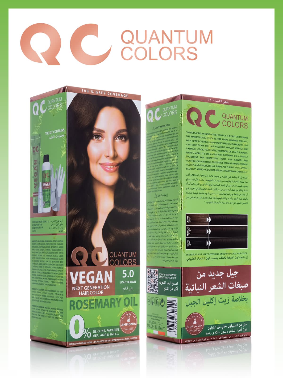 رنگ موی بدون آمونیاک گیاهی وگان QC Quantum Colors – شماره 5.0 | قهوه‌ای روشن (Light Brown)