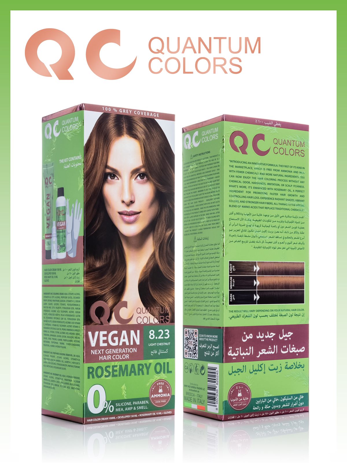 رنگ موی بدون آمونیاک گیاهی وگان QC Quantum Colors – شماره 8.23 | قهوه‌ای روشن (Light Chestnut)